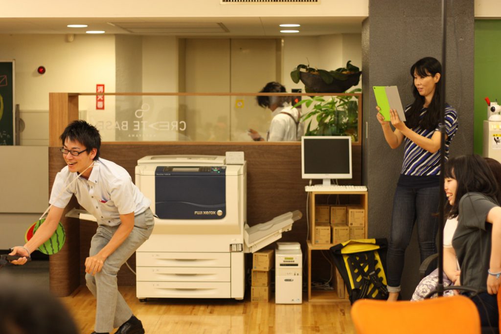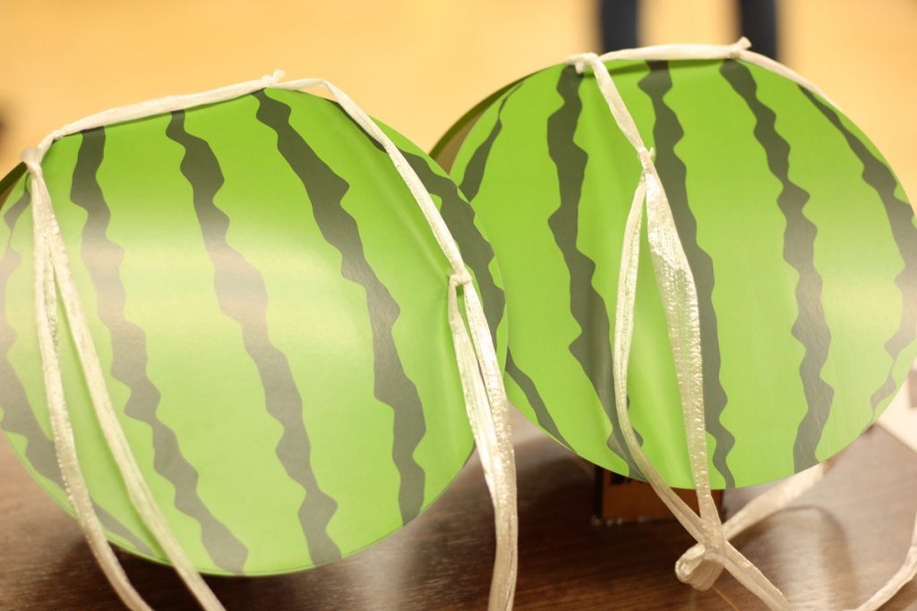 1人は、コントローラーを持って指示を頼りに見えないスイカを割ります。