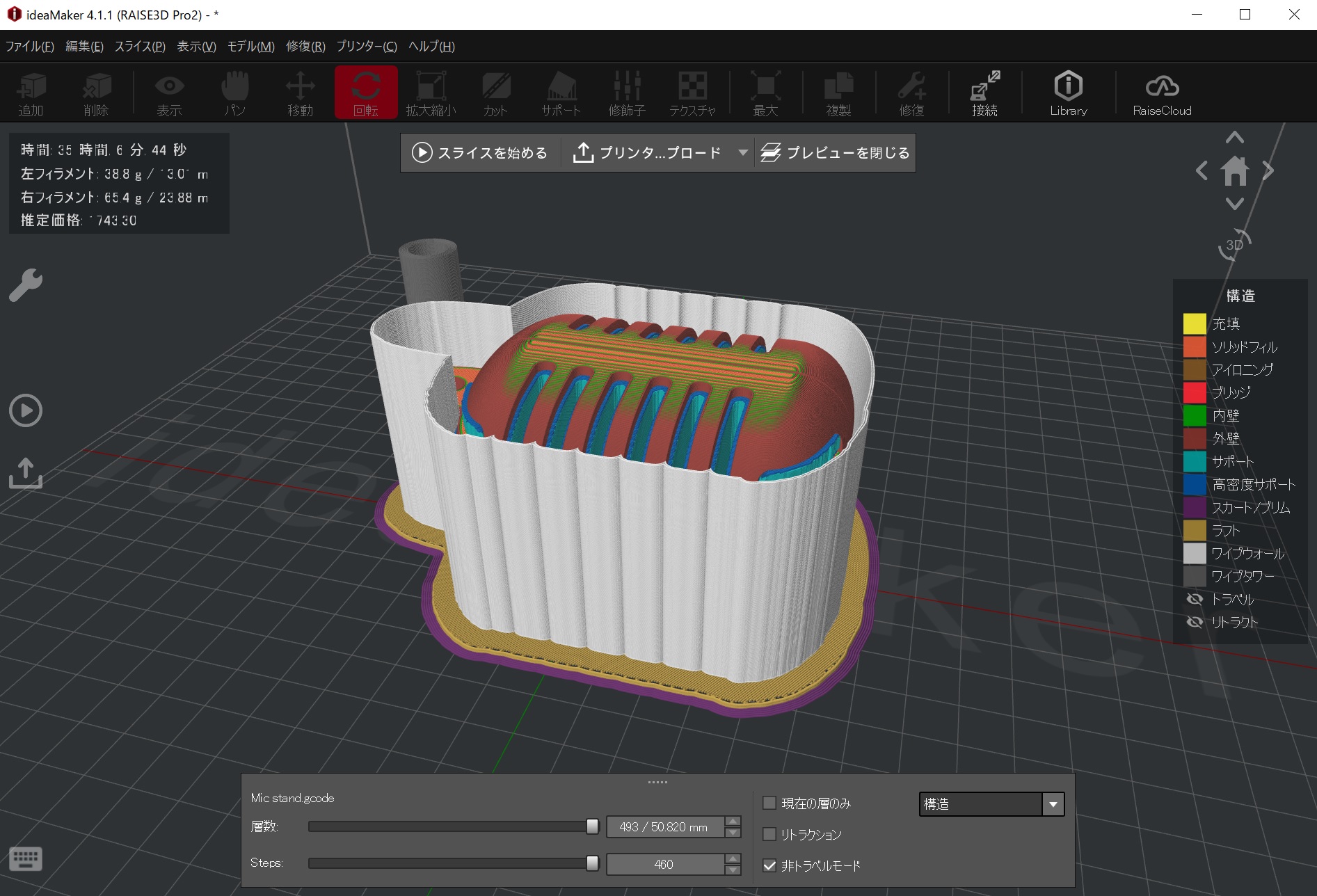 早速、Raise純正のスライスソフト ideaMakerでスライス、フィラメント毎の設定も最初から用意されており、とても簡単&スピーディ!
