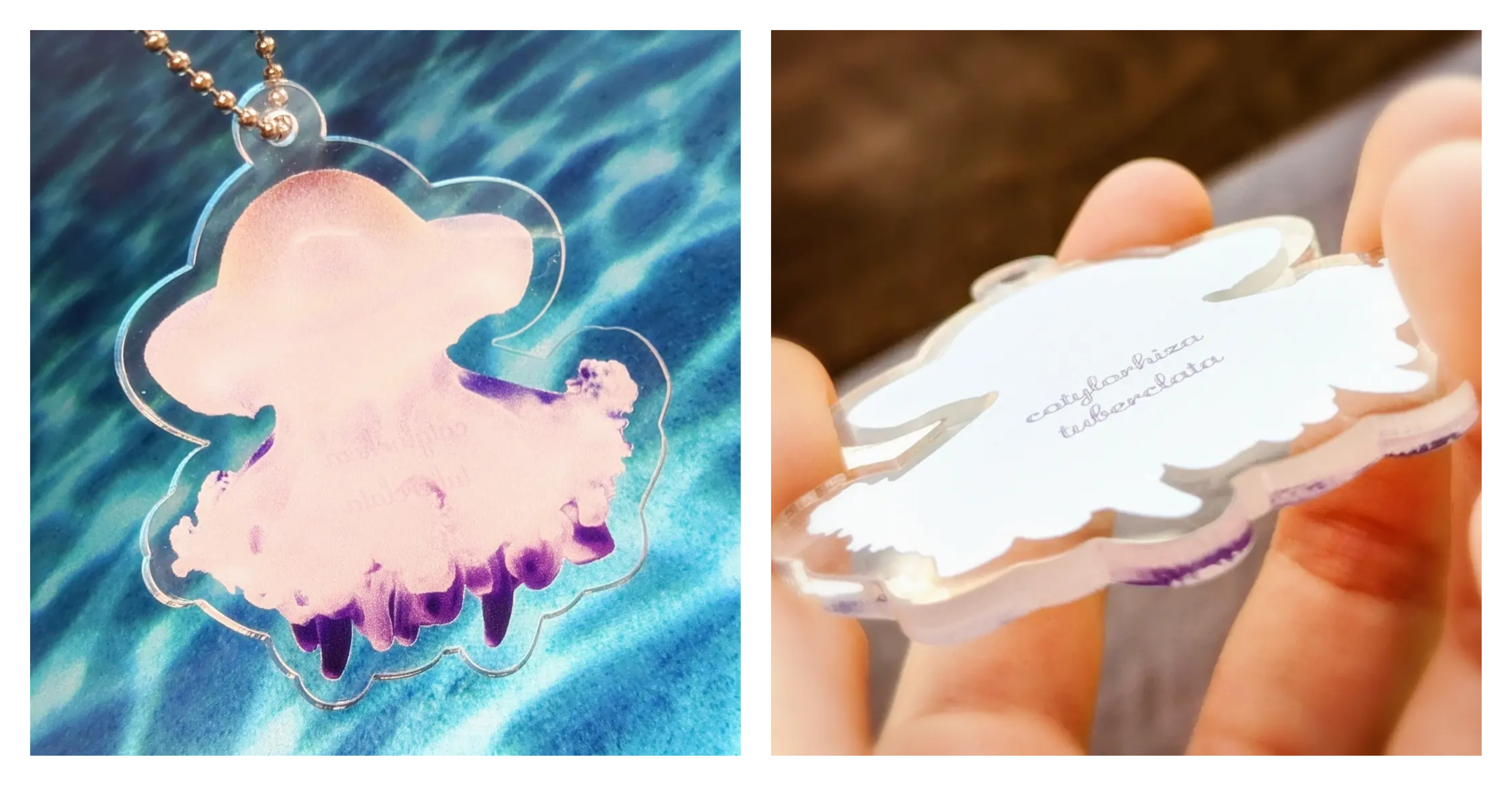 こちらも再びレーザー加工機とUVプリンタのコンビで制作、くらげの写真を利用したアクリルキーホルダーです。