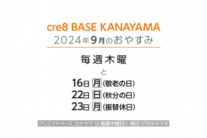 9月は木曜定休に加え、祝日が3回とお休みが多めとなっております。