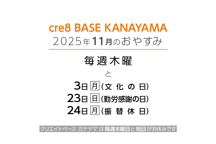 11月は3日と23日、24日の祝日と、毎週木曜日がお休みです!