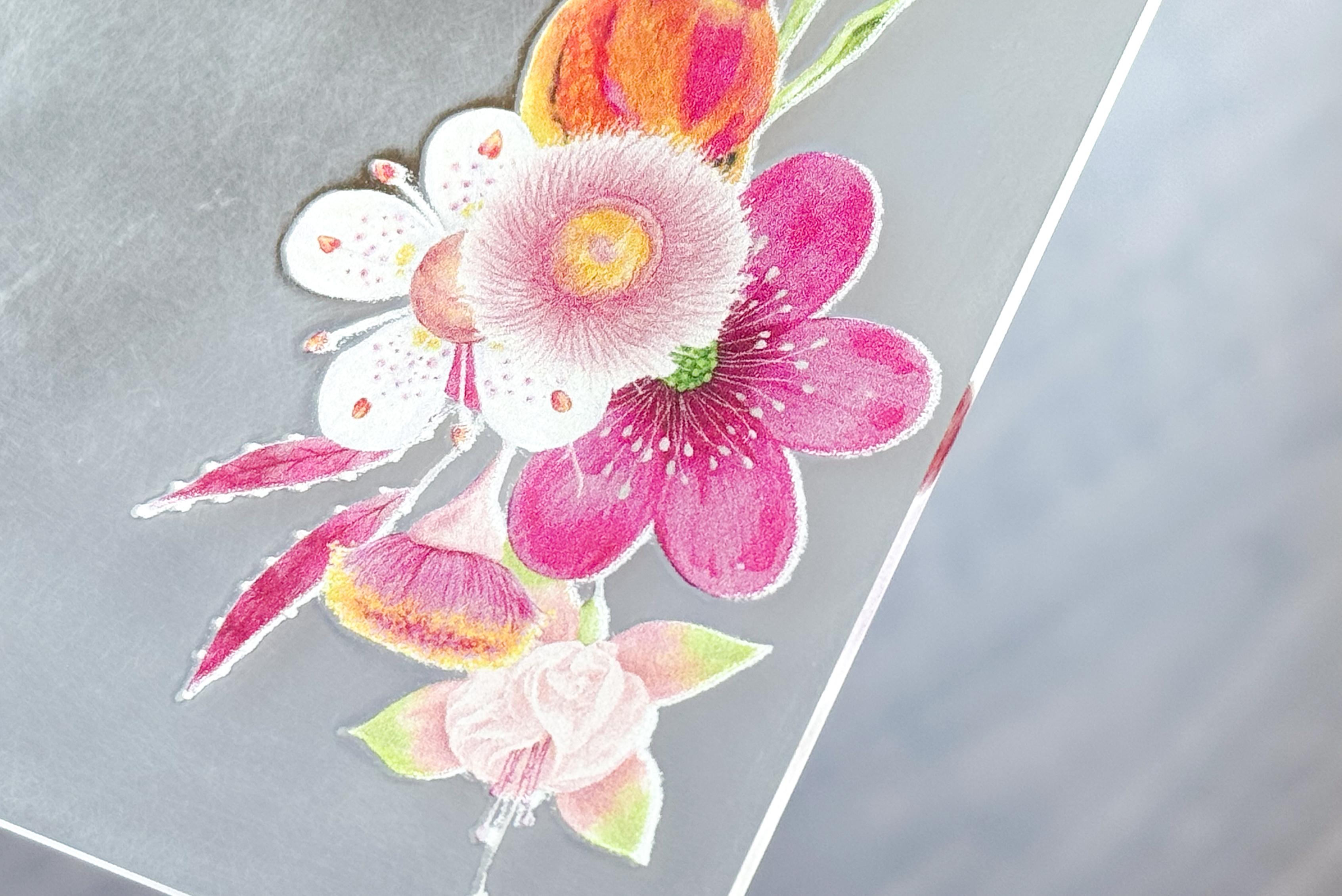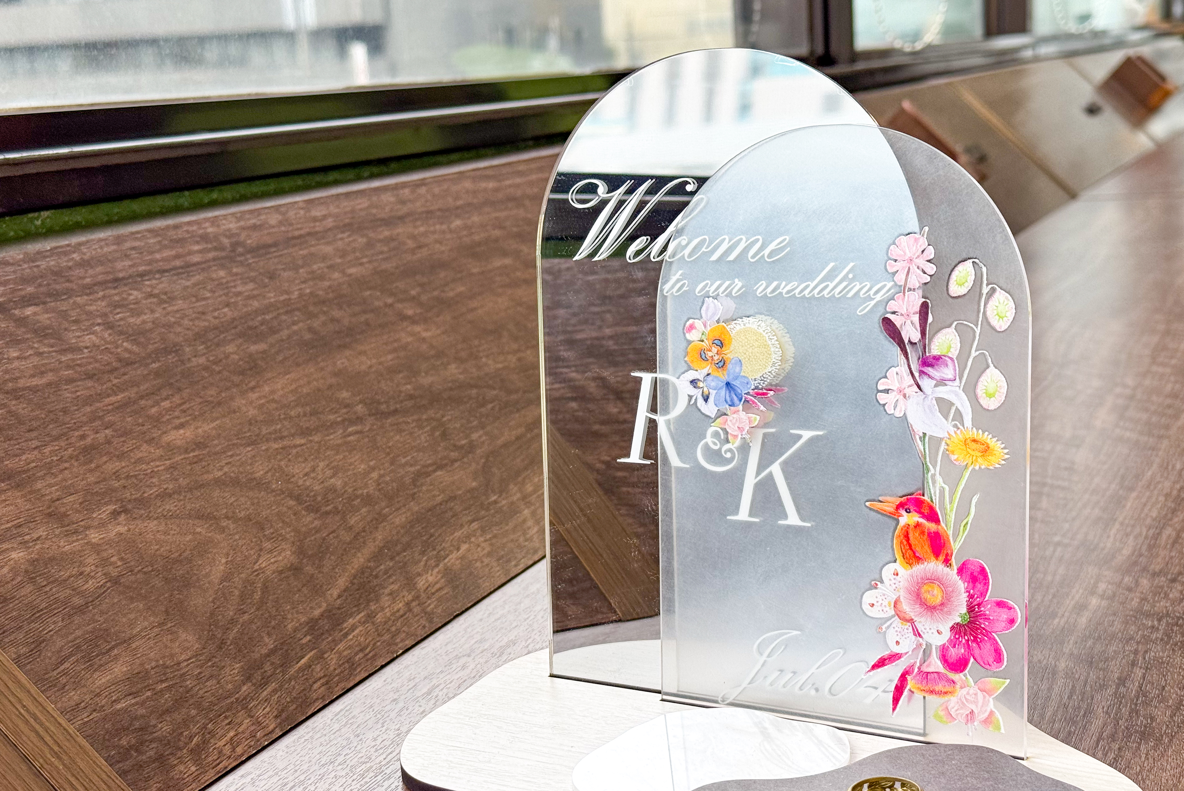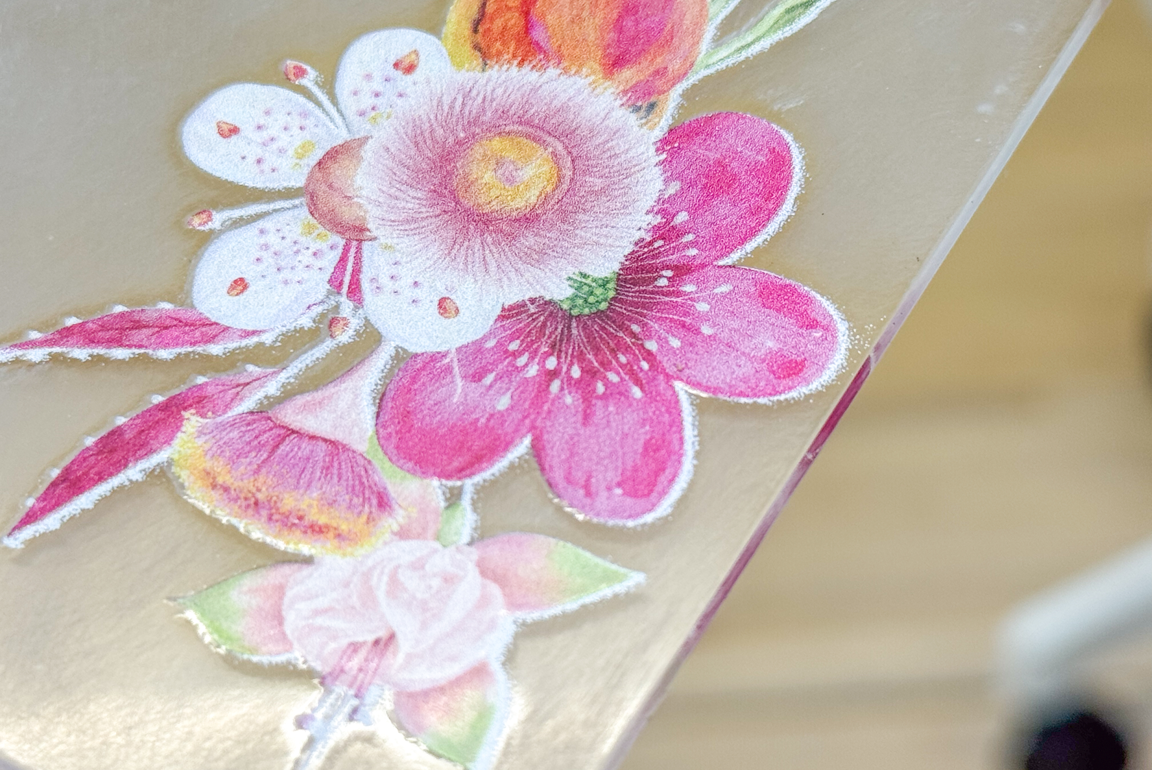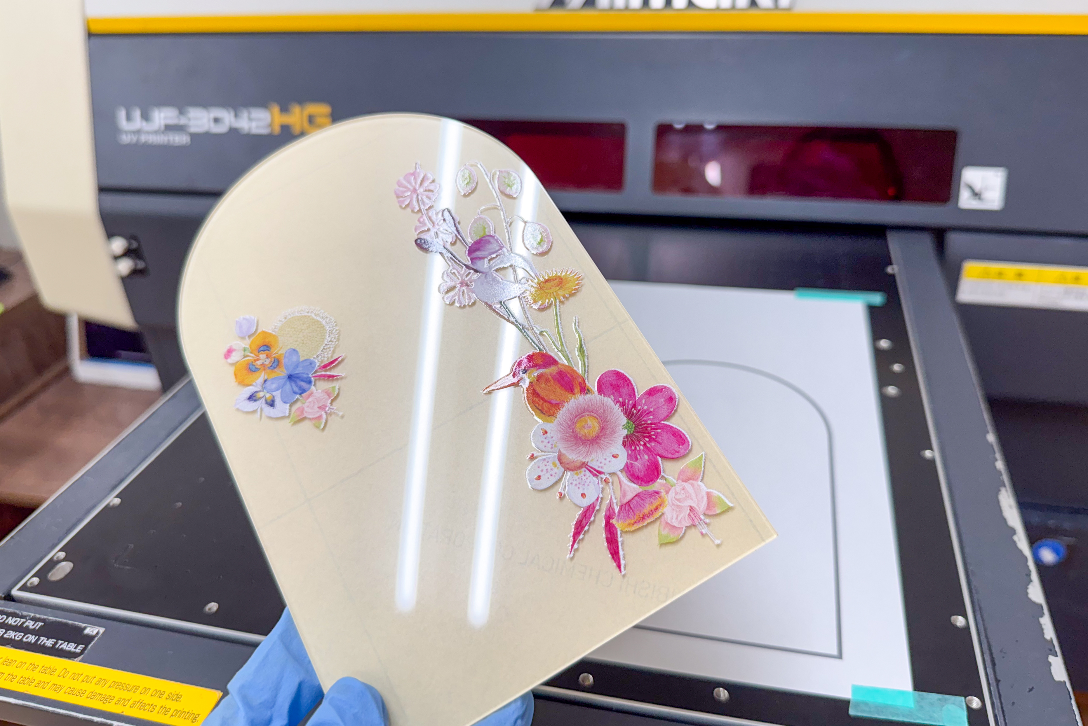 透明のアクリル板にダイレクトUVプリンタで印刷したんです。